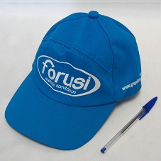 BONÉ EM TECIDO AZUL CLARO. NA FRENTE, ESTAMPADO EM BRANCO, 'FORUSI METAIS SANITÁRIOS'. NAS LATERAIS E NA PARTE POSTERIOR, 'WWW.GRUPOFORUSI.COM.BR'.