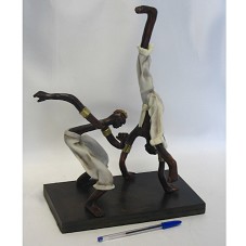 ESCULTURA (32,5X23X16 CM) CONFECCIONADA EM PORCELANA FRIA, REPRESENTANDO DOIS CAPOEIRISTAS NEGROS JOGANDO CAPOEIRA. FIXADOS EM BASE DE MADEIRA (2X25X15 CM) ONDE HÁ O NOME DA ARTISTA GRAVADO 'ANA CARVALHO 2009'. ACOMPANHA DUAS ETIQUETAS, UMA COM DADOS DO ARTISTA E OUTRA COM INSTRUÇÕES DE LIMPEZA.