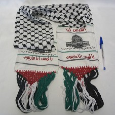 CHADOOR (115X15 CM), FAIXA EM TECIDO BRANCO, COM BORDADO PRETO AO LONGO DELA, FORMANDO DESENHOS DE LOSANGOS. NA BORDA, FACHADA DE UMA CONSTRUÇÃO COM INSCRIÇÕES ÁRABES. POSSUI BICO DE CROCHÊ, EM VERMELHO, COM FRANJAS NAS CORES VERDE, BRANCO E PRETO.