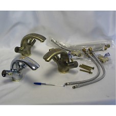 CONJUNTO DE TRÊS TORNEIRAS PARA LAVABO, COM UM PAR DE MISTURADORES ACOPLADO EM CADA UMA. UMA DELAS EM METAL CROMADO, COM DETALHES EM DOURADO, POSSUINDO O BRASÃO DA REPÚBLICA FEDERATIVA DO BRASIL GRAVADO E A INSCRIÇÃO 'PRESIDENTE', NOS MISTURADORES, 'LULA' E 'MARISA'. A SEGUNDA, IGUAL A ESSA, MAS EM METAL DE COR BRONZE, COM MESMA GRAVAÇÃO. A TERCEIRA, EM METAL IMITANDO BRONZE, COM O EMBLEMA DO TIME DE FUTEBOL CORÍNTHIANS, E A GRAVAÇÃO 'TORCEDOR Nº 1'. ACOMPANHA TRÊS PARES DE TUBOS FLEXÍVEIS PARA CONEXÃO, E ACESSÓRIOS DE MONTAGEM. ACONDICIONADO EM CAIXA BRANCA DE PAPELÃO, COM NOME DO FABRICANTE NA TAMPA.