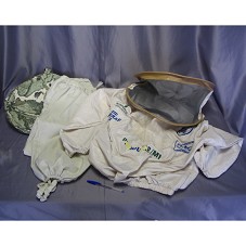 ROUPA / UNIFORME DE APICULTOR COMPOSTA POR CASACO E CALÇA, EM TACTEL BEGE. CASACO COM TELA NAS COSTAS, NO PEITO, E NO CHAPÉU. NA FRENTE, LOGOMARCAS DE INSTITUIÇÕES GOVERNAMENTAIS E PRIVADAS. ACONDICIONADA EM SACOLA CIRCULAR, DE TECIDO COM DESENHOS DE MAPAS, EM TONS DE VERDE.