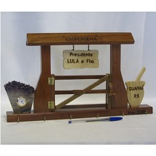 PORTA-CHAVES (24X42X5 CM) CONFECCIONADO EM MADEIRA, NO FORMATO DE UMA PORTEIRA. NA CUMEEIRA DESTA, A INSCRIÇÃO 'COOPERGEMA'. ABAIXO, PLACA DE MADEIRA PENDURADA, CONTENDO A GRAVAÇAÕ 'PRESIDENTE LULA E FLIA'. NA LATERAL ESQUERDA, CRISTAL DE ROCHA EM TOM LILÁS, COM UM RELÓGIO ANALÓGICO INCRUSTADO AO CENTRO. NA DIREITA, PEÇA DE MADEIRA NO FORMATO DE CUIA DE CHIMARRÃO, CONTENDO A GRAVAÇÃO 'QUARAÍ RS'. FIXADOS EM BASE DE MADEIRA, ONDE HÁ SEIS GANCHOS PARA COLOCAÇÃO DE CHAVES, E A INSCRIÇÃO 'MAR. 2009'. NO FUNDO DA BASE, CARIMBO DO FABRICANTE.