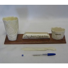 CONJUNTO DE ESCRITÓRIO COMPOSTO POR PORTA-LÁPIS (11X7X5 CM) COM EMBLEMA DO S.C. CORÍNTHIANS GRAVADO NA FRENTE; UM ABRIDOR DE CARTAS (16,5 CM) NO FORMATO DE UM PEIXE; PORTA-CLIPS (5X7X4,5 CM) COM O MAPA DO BRASIL NA PARTE FRONTAL; E UM PORTA-CARTÃO (3X13,5X3 CM) COM O NOME DO PRESIDENTE LULA GRAVADO. PEÇAS CONFECCIONADAS EM CHIFRE / OSSO, DE TOM CLARO. FIXADAS EM BASE DE MADEIRA (0,5X30X8 CM). NO FUNDO DA BASE, ETIQUETA COM A INSCRIÇÃO 'PROGRAMA MÃOS À OBRA / JARDIM-MS'.