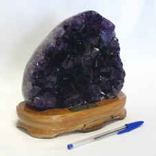 AMOSTRA (15,5X17X5 CM) DE CRISTAL DE ROCHA, DE COR LILÁS ARROXEADA. POSSUI PARTE FRONTAL COM CRISTAIS LAPIDADOS E PONTIAGUDOS, E LATERAIS POLIDAS. ENCAIXADA SOBRE BASE DE MADEIRA (4X19X9,5 CM), ONDE HÁ PLACA METÁLICA COM A GRAVAÇÃO 'LEMBRANÇA DE AMETISTA DO SUL - RS / ARRANJO PRODUTIVO LOCAL'.