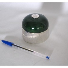 PORTA-JÓIA (7X7,5X7,5 CM) DE FORMATO CILÍNDRICO, COM TAMPA ABAULADA. POSSUI BORDA EXTERNA TEXTURIZADA EM PRATA 925; INTERNA REVESTIDA EM CAMURÇA BEGE. TAMPA ESMALTADA EM TONALIDADE VERDE E COBERTA INTERNAMENTE EM PRATA DOURADA 925. NA PARTE SUPERIOR DA TAMPA, MOEDA PRATEADA COM DESENHO DE UMA COROA, COM TRÊS PLUMAS DENTRO DESSA, TENDO NA BASE A INSCRIÇÃO 'ICH DIEN' (PROVAVELMENTE O SELO DO PRÍNCIPE). ACONDICIONADO EM ESTOJO FORRADO DE NAPA AZUL MARINHO.