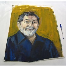 TELA (60X43,5CM) COM PINTURA RETRATANDO O PRESIDENTE LULA, EM PLANO AMERICANO, VESTIDO DE CAMISA AZUL ESCURO, TENDO FUNDO EM TOM OCRE. NA PARTE POSTERIOR, A INSCRIÇÃO 'MEU TRIBUTO A UM BRASILEIRO / CARREÑO'.