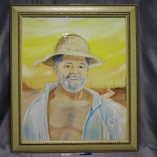 QUADRO (70X60 CM) COM MOLDURA EM MADEIRA LAMINADA E TAMPO DE VIDRO. EMOLDURA PINTURA SOBRE TELA, RETRATANDO O PRESIDENTE LULA COM CHAPÉU DE PALHA E CAMISA AZUL, TENDO, AO FUNDO, PAISAGEM DE UM DESCAMPADO ÁRIDO. NO CANTO INFERIOR DIREITO, ASSINATURA DO ARTISTA 'TONY DI PÁDUA / MIRANTE-BA'.