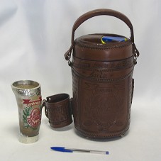 GARRAFA TÉRMICA CONFECCIONADA EM PLÁSTICO, REVESTIDA EXTERNAMENTE EM COURO. POSSUI TAMPA COM ROSCA, E NA PARTE SUPERIOR DESSA, BICO PARA DESPEJAR A BEBIDA. POSSUI ALÇA SUPERIOR E LATERAL; NAS LATERAIS, UM PORTA-COPO E UM LOCAL PARA COLOCAR A BOMBA DE CHIMARRÃO. NA PARTE FRONTAL, A INSCRIÇÃO 'LUIS INÁCIO L. DA SILVA / LULA', E DESENHO COM A LOGOMARCA DA 'ERVA MATE SANTO ANTÔNIO'. ACOMPANHA COPO (15 CM) CONFECCIONADO EM OSSO DE CHIFRE, COM BORDA E BASE EM PRATA, TENDO À FRENTE PINTURA COM MESMA LOGOMARCA; E UMA BOMBA DE CHIMARRÃO, EM PRATA.