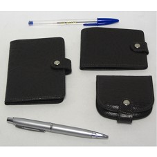 CONJUNTO DE COURO COMPOSTO POR: UMA CARTEIRA PARA NOTAS E CARTÃO; UM PORTA MOEDAS; UMA CARTEIRA PARA CARTÃO, COM BLOCO DE ANOTAÇÕES; E, UMA CANETA ESFEROGRÁFICA, COM CORPO IMITANDO METAL PRATEADO. CONJUNTO CONFECCIONADO EM COURO MARROM, COM LOGOMARCA DA 'FORUSI' MARCADA NELES. ACONDICIONADO EM CAIXA DE PAPELÃO, COM MESMA LOGOMARCA NA TAMPA.