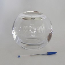 VASO / JARRO DECORATIVO (14 CM) CONFECCIONADO EM CRISTAL, COM BORDA EM PRATA 925. POSSUI FORMATO ESFÉRICO, COM O NOME DO FABRICANTE GRAVADO NA BORDA. ACONDICIONADO EM CAIXA FORRADA DE PAPEL ROXO, SEM TAMPA.