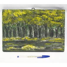 QUADRO (20X29,5 CM) COM PINTURA SOBRE MADEIRA RETRATANDO UM RIO COM UMA FLORESTA AO FUNDO. PREDOMINA TONS DE AMARELO, COM PINCELADAS VERDES E PRETAS. NO CANTO INFERIOR DIREITO, ASSINATURA DO ARTISTA 'MANOEL R. 2009'. NA PARTE POSTERIOR, PAPEL COLADO COM DADOS DO AGENTE.