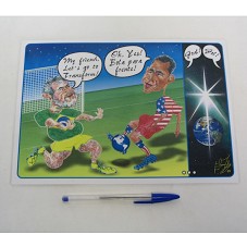 CARICATURA (20X28 CM) MOSTRANDO O PRESIDENTE LULA E O PRESIDENTE BARACK OBAMA, COM UNIFORMES DE FUTEBOL, BATENDO BOLA NO FORMATO DO GLOBO MUNDI, E FALANDO, RESPECTIVAMENTE, 'MY FRIEND, LET'S GO TO TRANSFORM' E 'OK, YES / BOLA PRA FRENTE'. AO LADO, FOTOGRAFIA DA TERRA E 'GOAL / GOL'. NO CANTO INFERIOR DIREITO, ASSINATURA DA ARTISTA 'ELIANA TAILIZ 09'. CARICATURA USANDO TÉCNICA MISTA DE MONTAGEM GRÁFICA, IMPRESSA EM PAPEL PLASTIFICADO.