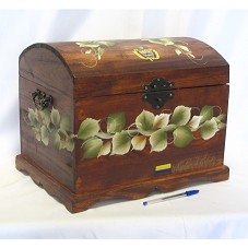 BAÚ (33X39,5X30,5 CM) CONFECCIONADO EM MADEIRA, COM ALÇAS LATERAIS EM METAL, E TRINCO FRONTAL (ESTE CHEGOU QUEBRADO). POSSUI PINTURA DE MOTIVOS FLORAIS, EM TONS DE BEGE E VERDE. NA TAMPA, O BRASÃO DA REPÚBLICA DA COLÔMBIA. NA LATERAL FRONTAL, A BANDEIRA DA COLÔMBIA E A INSCRIÇAÕ 'REPÚBLICA DE COLOMBIA'. POSSUI PARTE INTERNA COM DOZE DIVISÓRIAS.