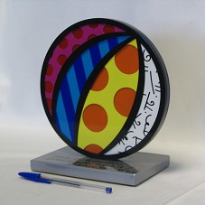 ESCULTURA (23X17X12 CM) NO FORMATO DE UMA BOLA, COM LISTRAS PRETAS COMO AS DE BASQUETE. CADA PARTE, COM MOTIVOS DIFERENTES, EM CORES: BRANCO COM PRETO; LARANJA COM AMARELO; TONS DE AZUL E TONS DE ROSA. FIXADA EM BASE METÁLICA, ONDE HÁ A DEDICATÓRIA 'PARA O QUERIDO PRESIDENTE LULA / ROMERO BRITTO 09'; E DO OUTRO LADO, '455 SÃO PAULO'. POSSUI O FUNDO DA BASE FORRADO EM COURO PRETO, CONTENDO A INSCRIÇÃO 'BRITTO'. ESCULTURA É A MINIATURA DA DOADA À CIDADE DE SÃO PAULO NO SEU ANIVERSÁRIO DE 455 ANOS. ACONDICIONADA EM EMBALAGEM PRÓPRIA, DE PAPELÃO, NA COR AMARELO.
