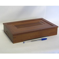 CAIXA / ESTOJO (6X30,5X20,5 CM) CONFECCIONADA EM MADEIRA. POSSUI TAMPA TRABALHADA COM ESPÉCIE DE VENEZIANA. ACONDICIONADA EM CAIXA DE PAPELÃO, DE COR LARANJA, COM IDEOGRAMAS CHINESES NA TAMPA.