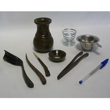 CONJUNTO PARA PREPARAÇÃO DE CHÁ, CONFECCIONADO EM MADEIRA DE TOM MARROM-ESVERDEADO, COMPOSTO POR SEIS PEÇAS. ACOMPANHA UM COADOR EM METAL PRATEADO, E UMA ESPIRAL METÁLICA AFUNILADA. ACONDICIONADO EM EMBALAGEM PRÓPRIA, DE PAPELÃO, COM FOTOGRAFIA DO OBJETO NA LATERAL FRONTAL.
