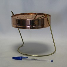 MINIATURA (3,5X15X15 CM) DE UM TAMBOR DE AÇO (STEEL DRUM), INSTRUMENTO TÍPICO DE TRINIDAD E TOBAGO. OBJETO CONFECCIONADO EM COBRE, COM DOIS BASTÕES DE METAL DOURADO FIXADOS NA PARTE SUPERIOR. À FRENTE, A INSCRIÇÃO 'TRINIDAD & TOBAGO'. INSTRUMENTO PRESO À HASTE METÁLICA DOBRADA NA BASE.