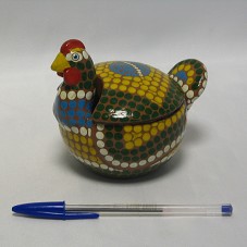 POTE CERÂMICO (10X9X9 CM) COM TAMPA, DE FORMATO CIRCULAR, POSSUINDO CAUDA E CABEÇA DE GALO. POSSUI PINTURA NAS CORES DA BANDEIRA BRASILEIRA, TENDO A MESMA NA TAMPA. PARTE INTERNA DESTA E BASE REVESTIDAS EM FELTRO.