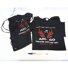 CAMISETA (TAM G) EM MALHA PRETA, DE MANGA CURTA. NA FRENTE, ESTAMPA EM PRATEADO E VERMELHO, COM DESENHO ESTILIZADO DE UMA ÁGUIA, E A INSCRIÇÃO 'ASSOCIAÇÃO DE RESGATE E CIDADANIA DO ESTADO DE GOIÁS / ARC-GO / TRABALHADORES - EXTINTA CAIXEGO - ANISTIA / JAMAIS SE DÊ POR VENCIDO'. ACOMPANHA SACOLA EM TECIDO PRETO, COM MESMA ESTAMPA; E, DO OUTRO LADO, DESENHO COM A INSCRIÇÃO 'UFG / LIGA DAS ENGENHARIAS'.