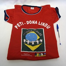 CAMISETA (TAM 12) EM MALHA VERMELHA, DE MANGA CURTA, COM DETALHES EM AZUL E BRANCO. NA FRENTE, ESTAMPA COM DESENHO ESTILIZADO DA BANDEIRA BRASILEIRA, COM CRIANÇAS DE MÃOS DADAS, E A INSCRIÇÃO 'PETI - DONA LINDU / CRIANÇA CIDADÃ / MINISTÉRIO DO DESENVOLVIMENTO SOCIAL / GOVERNO FEDERAL'. ATRÁS, 'PETI - DONA LINDU / FUNSOL / PREFEITURA DE ITUMBIARA'.