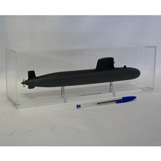 MAQUETE (5,5X30,5X4 CM) DO SUBMARINO 'SCORPENE', EM ESCALA 1/200, PINTADO EM PRETO, COM HÉLICE EM METAL DOURADO. APARAFUSADO EM BASE DE ACRÍLICO, ONDE HÁ A INSCRIÇÃO 'SCORPENE / ECH. 1/200E'. POSSUI REDOMA EM MESMO MATERIAL.