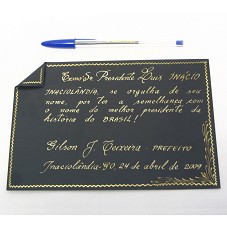 PLACA (10X20 CM) EM METAL PRETO, COM UMA DAS PONTAS DOBRADAS E GRAVAÇÃO EM DOURADO. POSSUI A INSCRIÇÃO 'EXMO. SR. PRESIDENTE LUIS INÁCIO / INACIOLÂNDIA, SE ORGULHA DE SEU NOME, POR TER A SEMELHANÇA COM O NOME DO MELHOR PRESIDENTE DA HISTÓRIA DO BRASIL / GILSON J. TEIXEIRA - PREFEITO / INACIOLÂNDIA - GO, 24 DE ABRIL DE 2009'. ACONDICIONADA EM ESTOJO FORRADO DE TECIDO AZUL ROYAL.