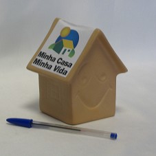 COFRE (12X9,5X10 CM) NO FORMATO DE UMA CASA CONFECCIONADO EM ARGILA. POSSUI DESENHOS DE JANELAS E PORTA GRAVADOS NAS LATERAIS. NA LATERAL POSTERIOR, O DESENHO DE UM ROSTO FELIZ. NO TELHADO, ADESIVO COLADO, CONTENDO A INSCRIÇÃO 'MINHA CASA MINHA VIDA' E DESENHO DE UMA CASA.