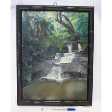 QUADRO (44,5X34 CM) COM MOLDURA EM MADEIRA DE TOM ESCURO, IMITANDO BAMBÚ. EMOLDURA PINTURA SOBRE TELA RETRATANDO UMA CACHOEIRA. PREDOMINA TONS ESCUROS DE VERDE, MARROM E PRETO. NO CANTO INFERIOR ESQUERDO, ASSINATURA DO ARTISTA E DATA (NÃO FOI POSSÍVEL IDENTIFICAR O ARTISTA). NA PARTE POSTERIOR DA TELA, QUASE APAGADA, A INSCRIÇÃO 'UMA DAS BELEZAS DA FAZENDA MONTE ALEGRE'; NA MOLDURA, ETIQUETA COLADA COM NOME DO QUADRO E OUTRA COM DEDICATÓRIA DO PREFEITO DE TELÊMACO BORBA'.