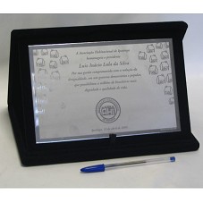 PLACA (14,7X22,8 CM) EM INOX, COM BORDAS POLIDAS. POSSUI A INSCRIÇÃO 'A ASSOCIAÇÃO HABITACIONAL DE IPATINGA HOMENAGEIA O PRESIDENTE LUIZ INÁCIO LULA DA SILVA POR SUA GESTÃO COMPROMETIDA COM A REDUÇÃO DA DESIGUALDADE, EM UM GOVERNO DEMOCRÁTICO E POPULAR, QUE POSSIBILITOU A MILHÕES DE BRASILEIROS MAIS DIGNIDADE E QUALIDADE DE VIDA. IPATINGA, 13 DE ABRIL DE 2009'. FIXADA EM ESTOJO ( ) FORRADO DE VELUDO PRETO.