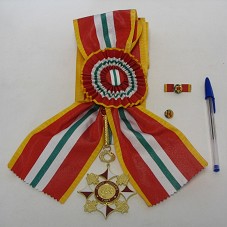 ORDEM DO MÉRITO JUDICIÁRIO DO DISTRITO FEDERAL E TERRITÓRIOS, NO GRAU DE GRÃ-CRUZ, COMPOSTA POR: UM BÓTON, COM FITA NAS CORES VERDE, VERMELHO E AMARELO, COM SÍMBOLO DA JUSTIÇA FIXADO NELE; UMA BARRETA, COM MESMO BÓTON FIXADO NELA; E UMA FAIXA COM LISTRAS NAS CORES AMARELO, VERMELHO, BRANCO E VERDE, LEVANDO UMA INSÍGNIA COMPOSTA POR UMA MEDALHA CENTRAL, COM FIGURA PERSONIFICADA DA JUSTIÇA E A BALANÇA, CIRCUNDADA PELA INSCRIÇÃO 'MÉRITO JUDICIÁRIO / TJDFT'; NO REVERSO, A FIGURA DA BALANÇA TRAÇADA COM OS MESMOS RISCOS DO PLANO PILOTO, E A INSCRIÇÃO 'TRIBUNAL DE JUSTIÇA DO DISTRITO FEDERAL E DOS TERRITÓRIOS / TJDFT'. MEDALHA CIRCUNDADA PELO SÍMBOLO DA BANDEIRA DO DISTRITO FEDERAL, EM VERMELHO E BRANCO, E PELO SÍMBOLO DA JUSTIÇA, EM METAL PRATEADO. ACONDICIONADO EM ESTOJO FORRADO DE TECIDO VERMELHO.