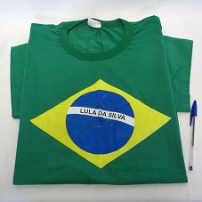 CAMISETA (TAM G) EM MALHA VERDE, DE MANGA CURTA. NA FRENTE, BANDEIRA DO BRASIL ESTAMPADA, COM A INSCRIÇÃO 'LULA DA SILVA' NA FAIXA DE 'ORDEM E PROGRESSO'. ATRÁS, EM AMARELO 'MOBILIZAÇÃO NACIONAL PARA O REGISTRO CIVIL DE NASCIMENTO E DOCUMENTAÇÃO BÁSICA' E LOGOMARCAS DE INSTITUIÇÕES GOVERNAMENTAIS.