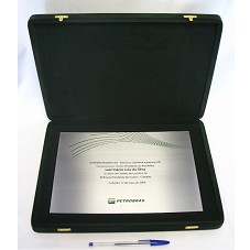 PLACA (21X30 CM) EM METAL PRATEADO, CONTENDO A GRAVAÇÃO 'A PETRÓLEO BRASILEIRO S/A - PETROBRAS AGRADECE A PRESENÇA DO EXCELENTÍSSIMO SENHOR PRESIDENTE DA REPÚBLICA LUIZ INÁCIO LULA DA SILVA / ÀS OBRAS DA CARTEIRA DE GASOLINA DA REFINARIA PRESIDENTE BERNARDES - CUBATÃO. CUBATÃO, 12 DE MAIO DE 2009 / PETROBRAS'. FIXADA EM ESTOJO FORRADO DE VELUDO VERDE.