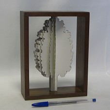 ESCULTURA EM KIRIGAMI (18X9X9 CM) NO FORMATO DE UMA ÁRVORE, CONFECCIONADO EM PAPEL CARTÃO BRANCO. FIXADO EM MOLDURA VAZADA (20X15X6 CM) DE MADEIRA REFLORESTADA. ACOMPANHA DOIS FOLHETOS: UM COM INFORMAÇÕES SOBRE A PEÇA; OUTRO, COM INFORMAÇÕES DA KLABIN. ACONDICIONADA EMBALAGEM PRÓPRIA DA KLABIN.