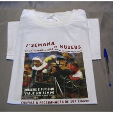 CAMISETA EM MALHA BRANCA, DE MANGA CURTA. NA FRENTE, ESTAMPA COM FOTOGRAFIAS DE BONECOS DE ARGILA, UM DELES TIRANDO FOTOGRAFIA, COM A INSCRIÇÃO '7ª SEMANA DE MUSEUS / 17 A 23 DE MAIO DE 2009 / 18 DE MAIO DIA INTERNACIONAL DE MUSEUS / MUSEUS E TURISMO / VIAJE NO TEMPO / HOMENAGEM AO CENTENÁRIO DE MESTRE VITALINO / CONFIRA A PROGRAMAÇÃO DE SUA CIDADE'. NA PARTE POSTERIOR, NOME E LOGOMARCAS DAS INSTITUIÇÕES DE REALIZAÇÃO.
