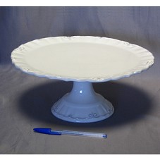 PRATO DE BOLO, COM PÉ, CONFECCIONADO EM CERÂMICA BRANCA ESMALTADA, COM BORDAS E PÉ TRABALHADOS. ACONDICIONADO EM CAIXA DE PAPELÃO. NA CAIXA, A INSCRIÇÃO 'WILSON E NADIA / PRES. ANIVERSÁRIO CASAMENTO 2009'.