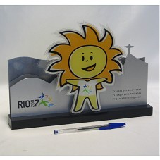 PLACA (13,5X30 CM) EM METAL PRATEADO, COM RECORTE MOSTRANDO O PERFIL DO CORCOVADO, NO RIO DE JANEIRO. POSSUI A INSCRIÇÃO 'XV JOGOS PAN-AMERICANOS', EM PORTUGUÊS, ESPANHOL E INGLÊS; E, AINDA, LOGOMARCA DOS JOGOS COM A INSCRIÇÃO 'RIO 2007'. FIXADO À FRENTE DA PLACA, O MASCOTE DOS JOGOS, EM PLACA ACRÍLICA. FIXADOS EM BASE DE ACRÍLICO PRETO (2X31X4,5 CM).