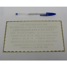 PLACA (12,5X20 CM) EM PRATA FOSQUEADA, COM BORDAS EM DOURADO. POSSUI A INSCRIÇÃO 'AO PRESIDENTE DA REPÚBLICA FEDERATIVA DO BRASIL LUIZ INÁCIO LULA DA SILVA / QUE DEUS ILUMINE SEU GOVERNO PARA O BEM DE NOSSA NAÇÃO, CONTE SEMPRE COM O APOIO DESTA GLORIOSA AGREMIAÇÃO / ASSOCIAÇÃO ATLÉTICA DIADEMA / FUNDADA EM 01/08/1929'. ACONDICIONADA EM ESTOJO FORRADO DE VELUDO PRETO.