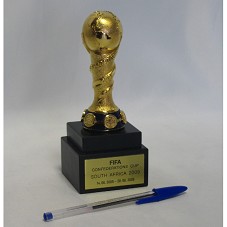 RÉPLICA DO TROFÉU DA COPA DAS CONFEDERAÇÕES. ESCULTURA (11X3,6X3,6 CM) CONFECCIONADA EM BRONZE, COM BASE AZULADA. FIXADA EM BASE DE MADEIRA (5,5X7X7 CM) ESCALONADA E PINTADA DE PRETO, TENDO, À FRENTE, PLACA METÁLICA COM A GRAVAÇÃO 'FIFA / CONFEDERATIONS CUP SOUTH AFRICA 2009 / 14.06.2009 - 28.06.2009'. ACONDICIONADA EM ESTOJO CINZA, COM LOGOMARCA DA FIFA NA TAMPA.