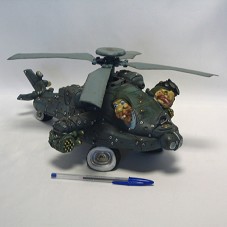 ESCULTURA (19X33X35 CM). HELICÓPTERO DE GUERRA PINTADO EM TOM CINZA-ESVERDEADO. DAS JANELAS SAEM AS CABEÇAS DOS PILOTOS, MODELADAS EM CARICATURA.