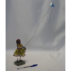 ARTESANATO (18 CM) CONFECCIONADO EM JORNAL, FIGURA DE UMA MENINA, COM VESTIDO ESTAMPADO DE GIRASSÓIS AMARELOS, SEGURANDO UMA PETECA E SOLTANDO UMA PIPA. FIXADA EM BASE RETANGULAR, ONDE NO FUNDO HÁ ETIQUETA COM A INSCRIÇÃO 'BONEQUINHOS DE JORNAL / TEL.: (71) 3207-2111 / CEL.: 8822-1798 / ELZA 3314-1292 / [email protected]'.