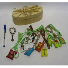 DEZ COLARES CONFECCIONADOS EM FIO ENCERADO, TENDO COMO PINGENTE UM PEQUENO SACO DE ALGODÃO, CADA UM BORDADO COM MOTIVO DIFERENTE (FLORA E FAUNA). CONFECCIONADOS EM CORES VARIADAS. ACOMPANHA UM TERÇO DE DEDO, COM CONTAS EM CERÂMICA BRANCA PINTADA E PINGENTE DO DIVINO ESPÍRITO SANTO. ACONDICIONADOS EM CAIXA OVAL DE MADEIRA, COM RAMOS DE TRIGO NA TAMPA.