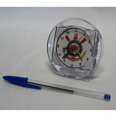 RELÓGIO ANALÓGICO DE MESA (8X8X2 CM) CONFECCIONADO EM PLÁSTICO TRANSPARENTE, COM FRENTE CIRCULAR. FUNDO DA FRENTE DO RELÓGIO EM PAPEL, COM EMBLEMA DO TIME DE FUTEBOL S.C. CORÍNTHIANS IMPRESSO.