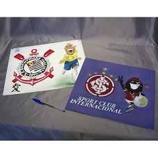 DUAS PLACAS EM CHAPA METÁLICA, COM FUROS PARA FIXAÇÃO. A PRIMEIRA (30X33,5 CM) POSSUI A INSCRIÇÃO 'SPORT CLUB INTERNACIONAL', SEU EMBLEMA E DESENHO DO SACI VESTIDO COM O UNIFORME DO TIME, SOBRE FUNDO VIOLETA. NA PARTE POSTERIOR, FOLHETO DA 'REDE MARISTA DE EDUCAÇÃO E SOLIDARIEDADE / INCLUSÃO DIGITAL MARISTA'. A SEGUNDA (32X39 CM), SOBRE FUNDO BRANCO, CARICATURA DO JOGADOR RONALDO AO LADO DO EMBLEMA DO TIME DE FUTEBOL CORINTHIANS. POSSUI ADESIVO DA MESMA REDE DE COLÉGIO.