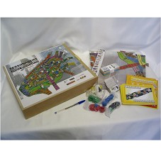 JOGO EDUCATIVO 'PERSONAGENS DO CENTRO DE PORTO ALEGRE', COMPOSTO POR: TABULEIRO FORMADO DE QUATRO PEÇAS; UM DADO; SEIS PINOS DE PLÁSTICOS COM CORES DIFERENTES; SEIS CARTELAS 'INVENTÁRIO PARTICIPATIVO'; TRINTA E SETE CARTAS 'PRESERVAR/TRANSGREDIR'; TRINTA PERSONAGENS; CENTO E VINTE BOTÔES DE SEIS CORES DIFERENTES; DINHEIRO 'PRATAS'; MANUAL COM REGRAS DO JOGO. ACONDICIONADO EM CAIXA DE MADEIRA MDF, COM ADESIVO NA TAMPA, MOSTRANDO O JOGO.