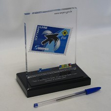 PLACA ACRÍLICA (14X11 CM) COM ADESIVO DE SELO AZUL CONTENDO DA INSCRIÇÃO 'SOFTWARE LIVRE / FISL / SERPRO' E DESENHO DE UMA SETA VOANDO. NA PARTE SUPERIOR DA PLACA, 'WWW.SERPRO.GOV.BR'; NA INFERIOR, LOGOMARCAS DO GOVERNO FEDERAL E DO SERPRO. FIXADA EM BASE ACRÍLICA PRETA (2X14X8 CM), ONDE HÁ A INSCRIÇÃO 'TODAS AS TECNOLOGIAS TEM LIMITES. O QUE NÃO TEM LIMITE É NOSSA CAPACIDADE DE TRABALHAR JUNTOS.'.