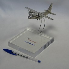 MAQUETE DO AVIÃO C-27J SPARTAN (4X11X14,2 CM) CONFECCIONADO EM PRATA 900. POSSUI NOME GRAVADO NAS LATERAIS POSTERIORES. ACOMPANHA BASE ACRÍLICA (2X12X12 CM) COM A INSCRIÇÃO 'FINMECCANICA / C-27J SPARTAN', SUPORTE METÁLICO, E CARTÃO EM NOME DO AGENTE. ACONDICIONADO EM ESTOJO DE MADEIRA (6X26X17,5 CM).