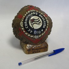 ARTESANATO (11X12X9 CM) CONFECCIONADO COM CASCA DE COCO FIXADA EM BASE DE MADEIRA. NA CASCA, O BRASÃO DO TIME DE FUTEBOL 'S.C. CORINTHIANS PAULISTA' PINTADO. NA PARTE POSTERIOR DA CASCA DO COCO, AS INICIAIS 'A.S.'. NA BASE, A INSCRIÇÃO 'VER. CHIQUINHO AO PRESIDENTE LULA / CARLINDA - MATO GROSSO / CEL. 66 84217204'.