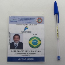 CRACHÁ (13X9 CM) DA 'XXXVII REUNIÓN DEL CONSEJO DEL MERCADO COMÚN Y CUMBRE DE PRESIDENTES DE LOS ESTADOS PARTES DEL MERCOSUR Y ESTADOS ASOCIADOS', EM NOME DO PRESIDENTE LUIZ INÁCIO LULA DA SILVA, COM SUA FOTOGRAFIA E COM A BANDEIRA DO BRASIL. POSSUI A DATA DO EVENTO '23 Y 24 DE JULIO DE 2009'.