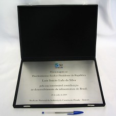 PLACA (22X32,5 CM) EM METAL PRATEADO. POSSUI A INSCRIÇÃO '50 ANOS SINICON / HOMENAGEM AO EXCELENTÍSSIMO SENHOR PRESIDENTE DA REPÚBLICA LUIZ INÁCIO LULA DA SILVA / PELA SUA INESTIMÁVEL CONTRIBUIÇÃO AO DESENVOLVIMENTO DA INFRAESTRUTURA DO BRASIL. / 29 DE JULHO DE 2009 / SINDICATO NACIONAL DA INDÚSTRIA DA CONSTRUÇÃO PESADA - SINICON'. FIXADA EM ESTOJO (3,7X33,5X23,5 CM) FORRADO DE TECIDO PRETO.