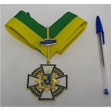 COMENDA CONSELHO BRASILEIRO DE OFTALMOLOGIA. INSÍGNIA NO FORMATO DE UMA CRUZ BRANCA DE BORDAS AZUIS, COM AS PONTAS VOLTADAS AO CENTRO. NESTE, O BRASÃO DO CONSELHO BRASILEIRO DE OFTALMOLOGIA. ENTRE OS BRAÇOS DA CRUZ, RAMOS DE FOLHAS. NO REVERSO, O NÚMERO '27' GRAVADO. PRESA Á FAIXA DE LISTRAS VERDE E AMARELO, COM PLAQUETA CONTENDO A INSCRIÇÃO 'COMENDA CBO'.